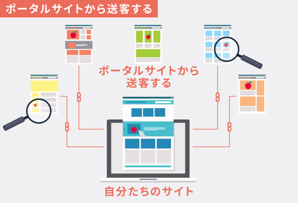 もう少し詳しく説明すると、あなたの会社の情報、サービス、商品が『ポータルサイト』に掲載され、そこを起点にあなたのサイトに流入してきます。